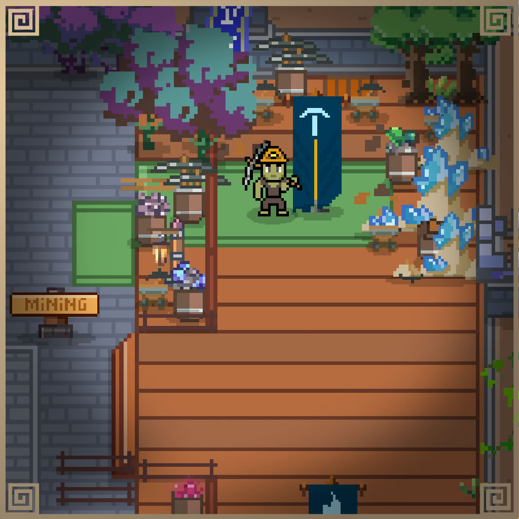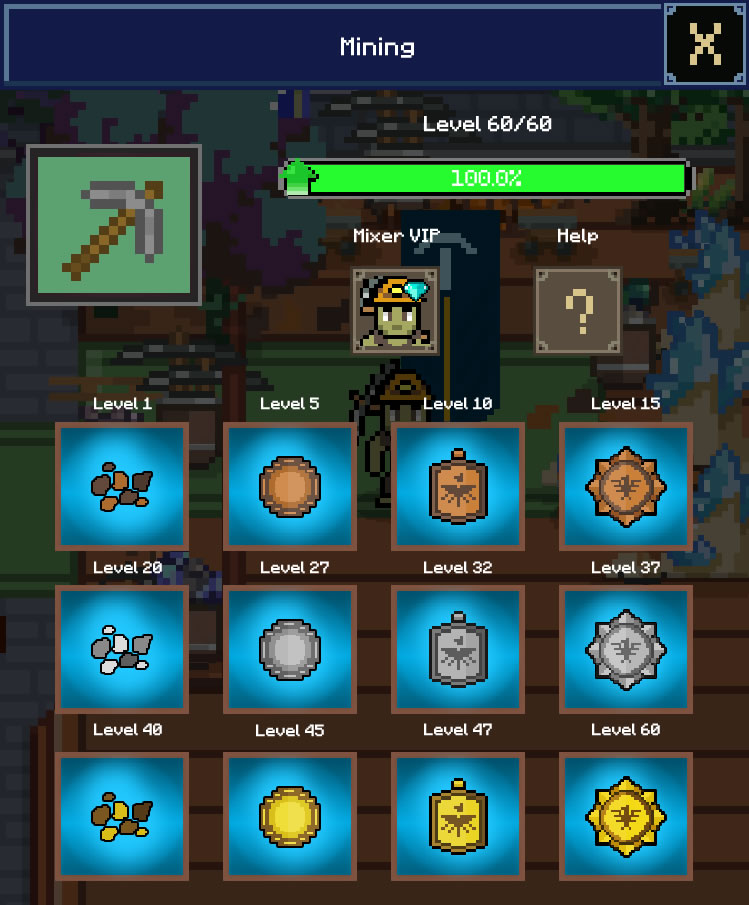 Here you can find the mining progression. You start at level 1 by collecting minerals, and as you combine four of them with your NPC, your profession level will increase, gradually unlocking better minerals.